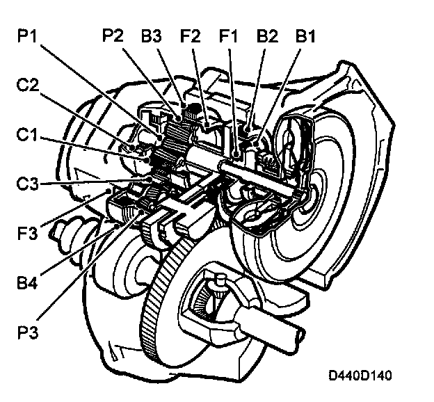 The automatic transmission consists of three planetary gear trains with clutches, brakes and freewheel. It has twin shafts (primary and secondary shafts). Of the three planetary gear trains, two (P1 and P2) constitute the transmission's primary shaft. The rear planetary gear train (P1) is a single planetary gear train and the front (P2) has a double set of planet gears. The outer one consists of the short planet gears and the inner one of the long planet gears. The inner planet gears and sun wheel shaft are common to P1 and P2.