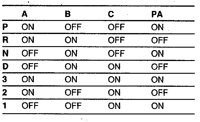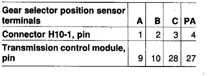 The following table shows the relationship between the gear selector position sensor's internal terminals A, B, C and PA and the pins of connector H10-1 and those of the transmission control module.