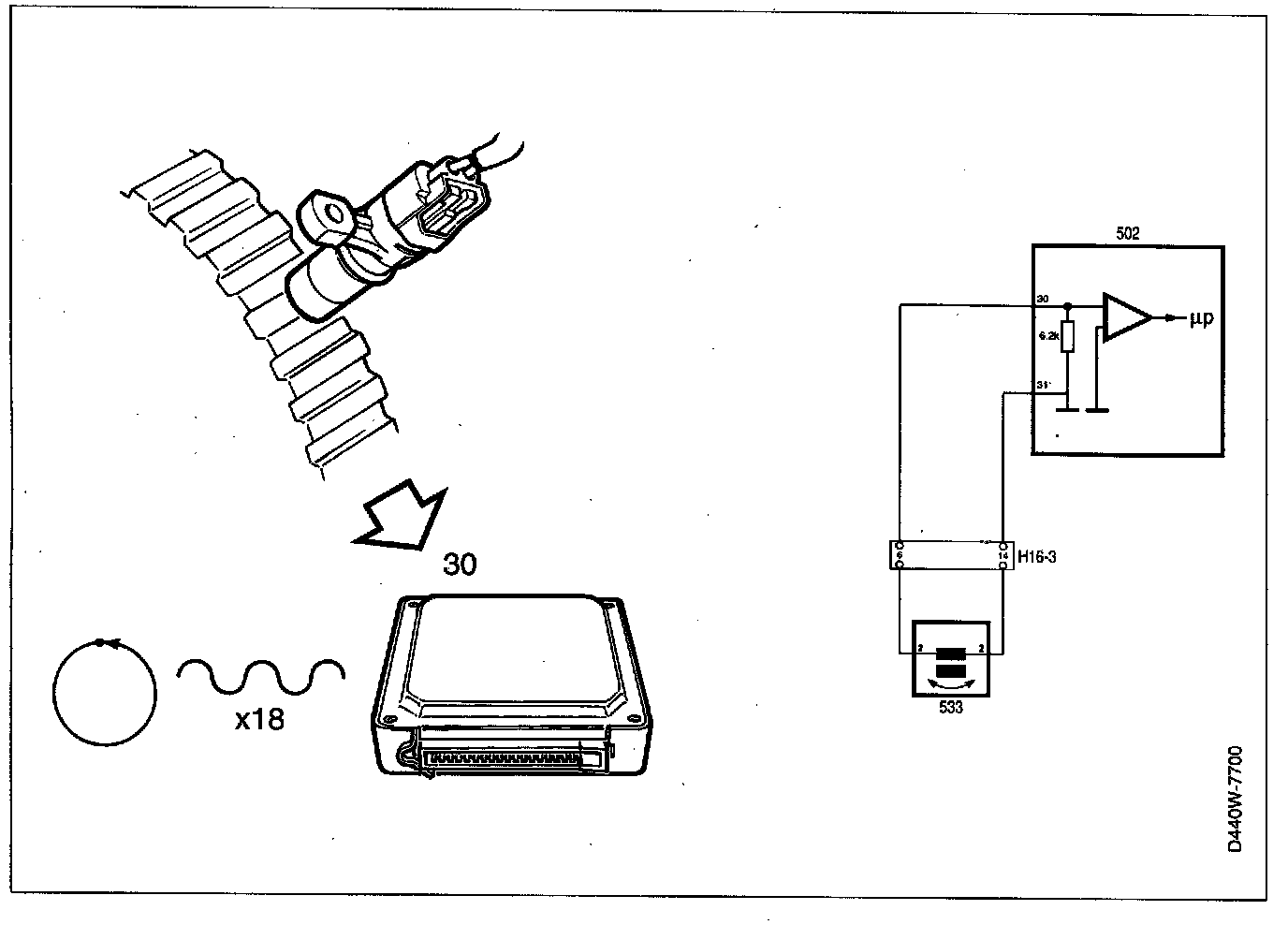 The sensor's signal voltage, a sine voltage, increases with vehicle speed. At 30 km/h it is about 1.1 V a.c. and 110 Hz measured across the sensor's two pins.