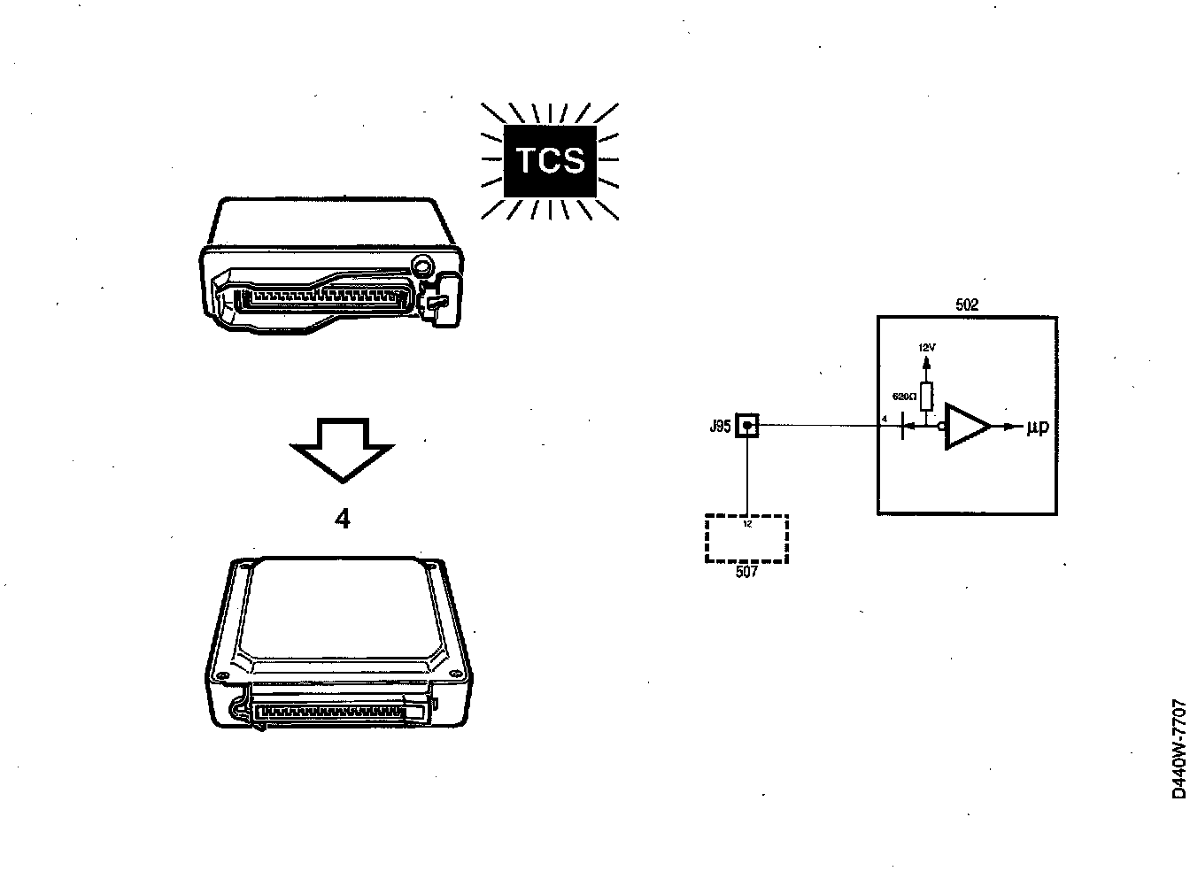 The TCS indicator lamp in the main instrument display panel lights up at the same time. This is because the TCS control module grounds pin 12. Pin 4 of the transmission control module is also grounded simultaneously.