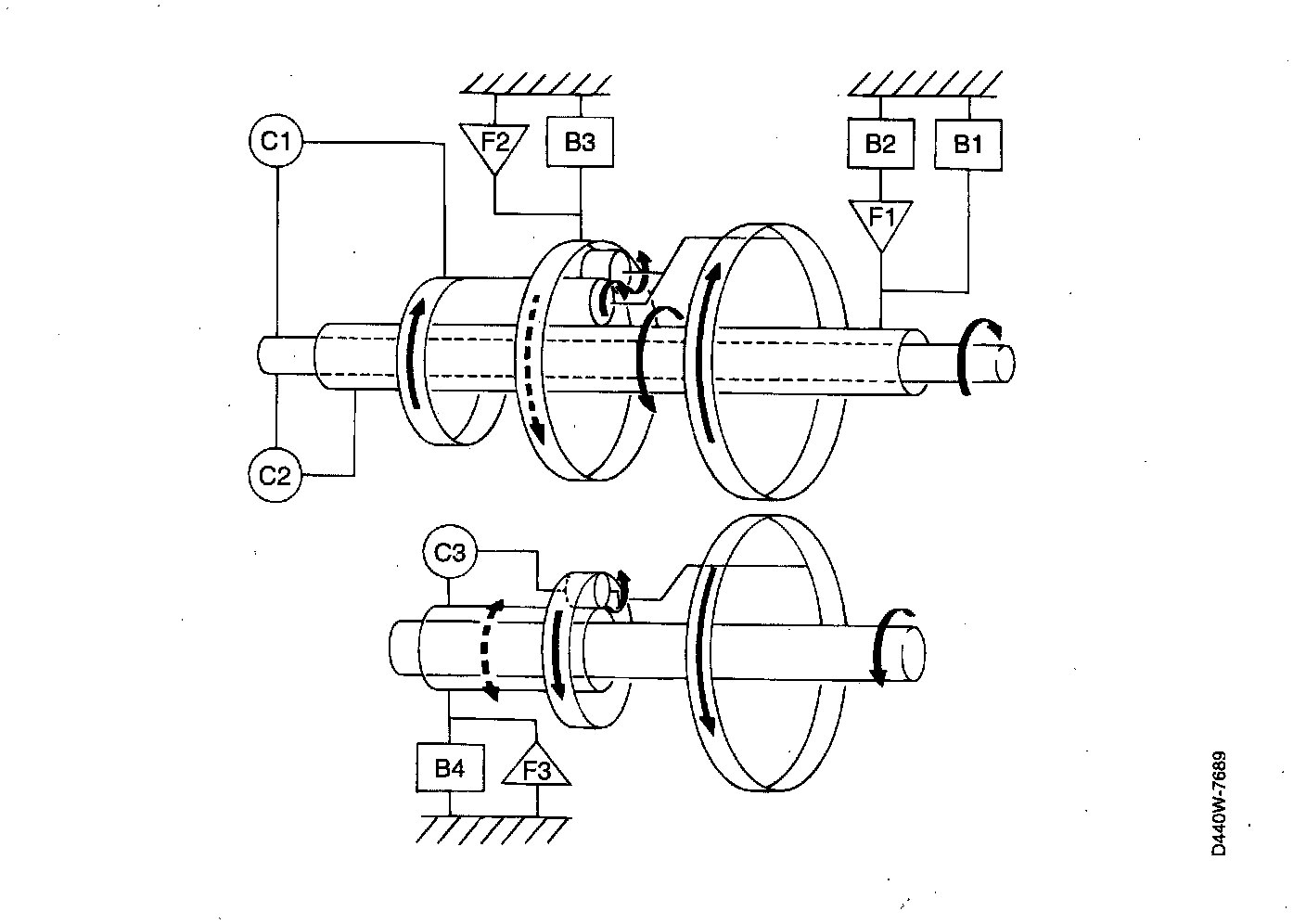The input shaft rotates clockwise and is connected to the rear planetary gear train's (P1) ring gear by clutch C1. The result is that the input shaft and the rear planetary gear train's ring gear rotate clockwise as a unit.