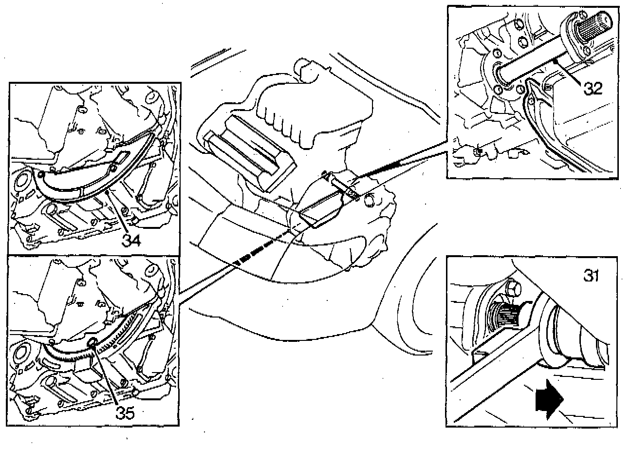 31. Separate the righthand drive shaft at the intermediate shaft's mounting point on the engine, using separation tool 89 96 654, or equivalent.
