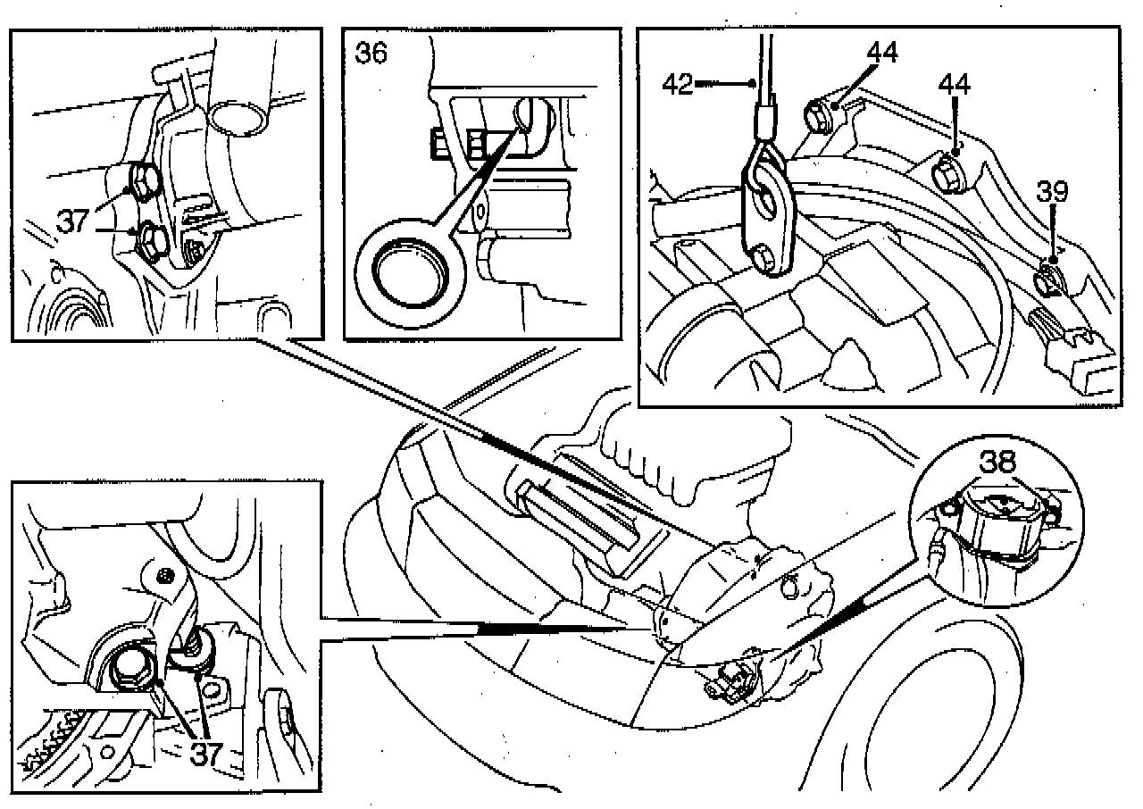42. Fasten lifting wire tool No. 87 92 442, or equivalent, to the transmission's rear securing hole and attach the wire to a hoist.