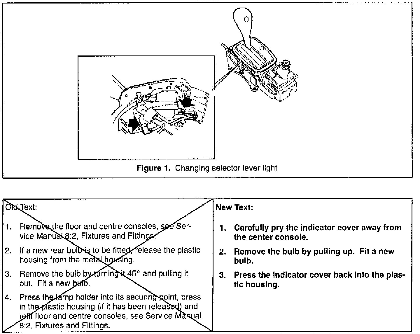 When changing the selector lever light on a 1994-96 900 model equipped with automatic transmission, please follow the directions shown above rather than those shown on page 472-25 of the above referenced manual. We would suggest that you copy this bulletin and place it in the appropriate page in the service manual.