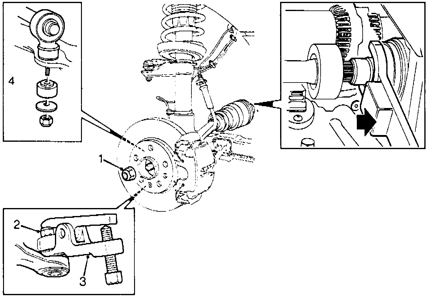 3. Remove hub center nut (1), then the ball joint nut (2).