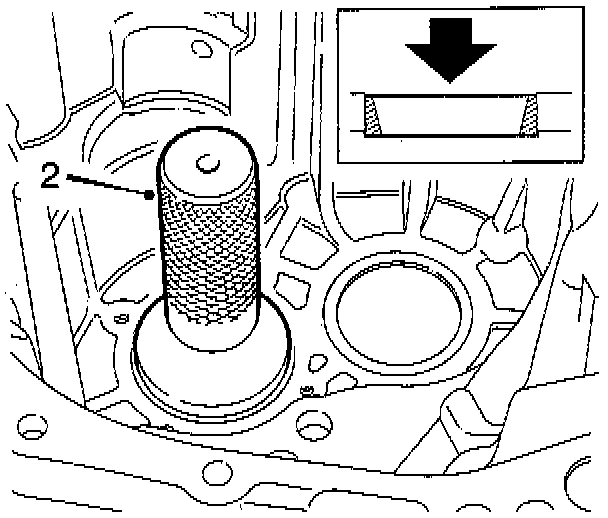 2. Then press down the bearing race with driver tool No. 87 92 202, or equivalent, until the tool reaches the bottom of the gear case.