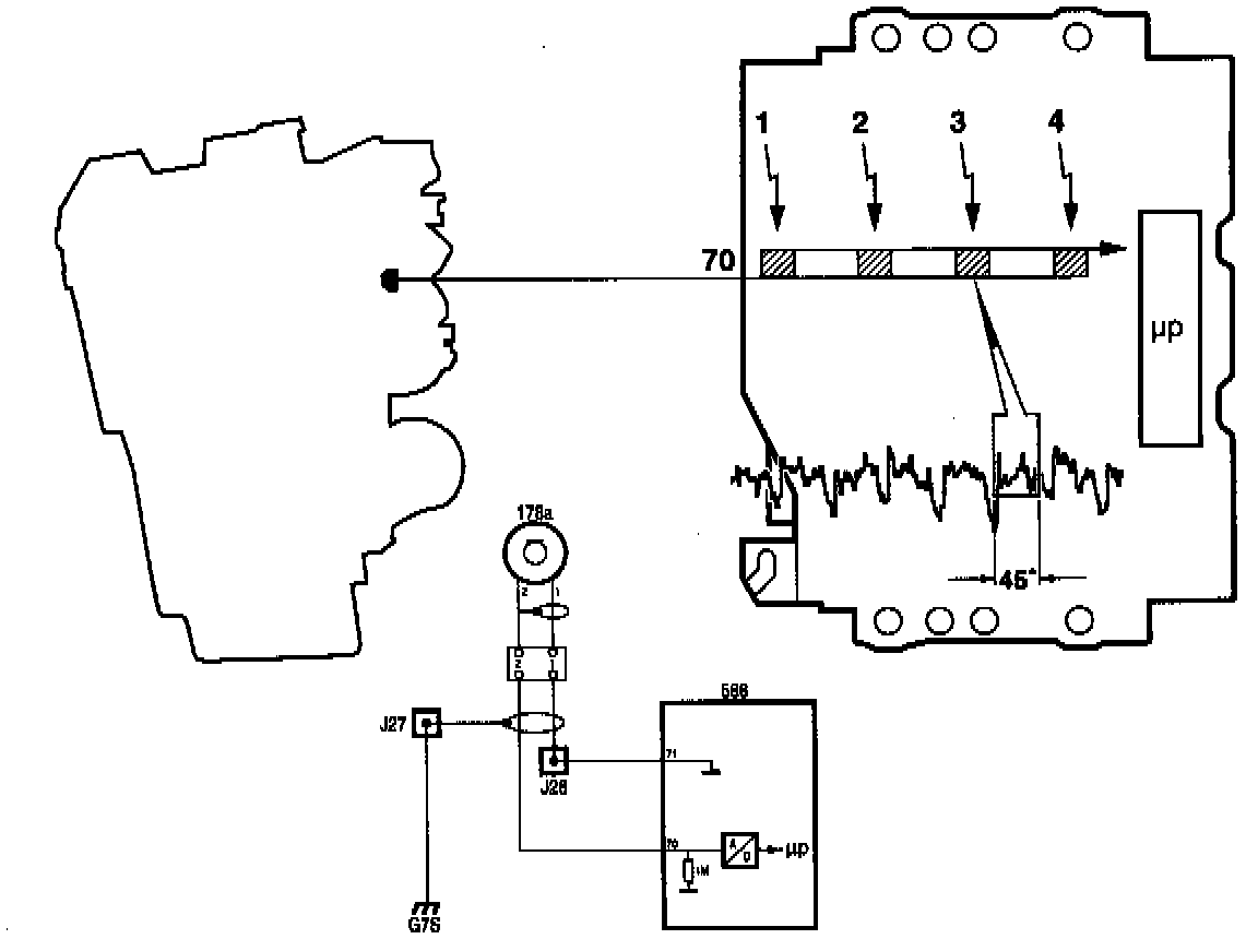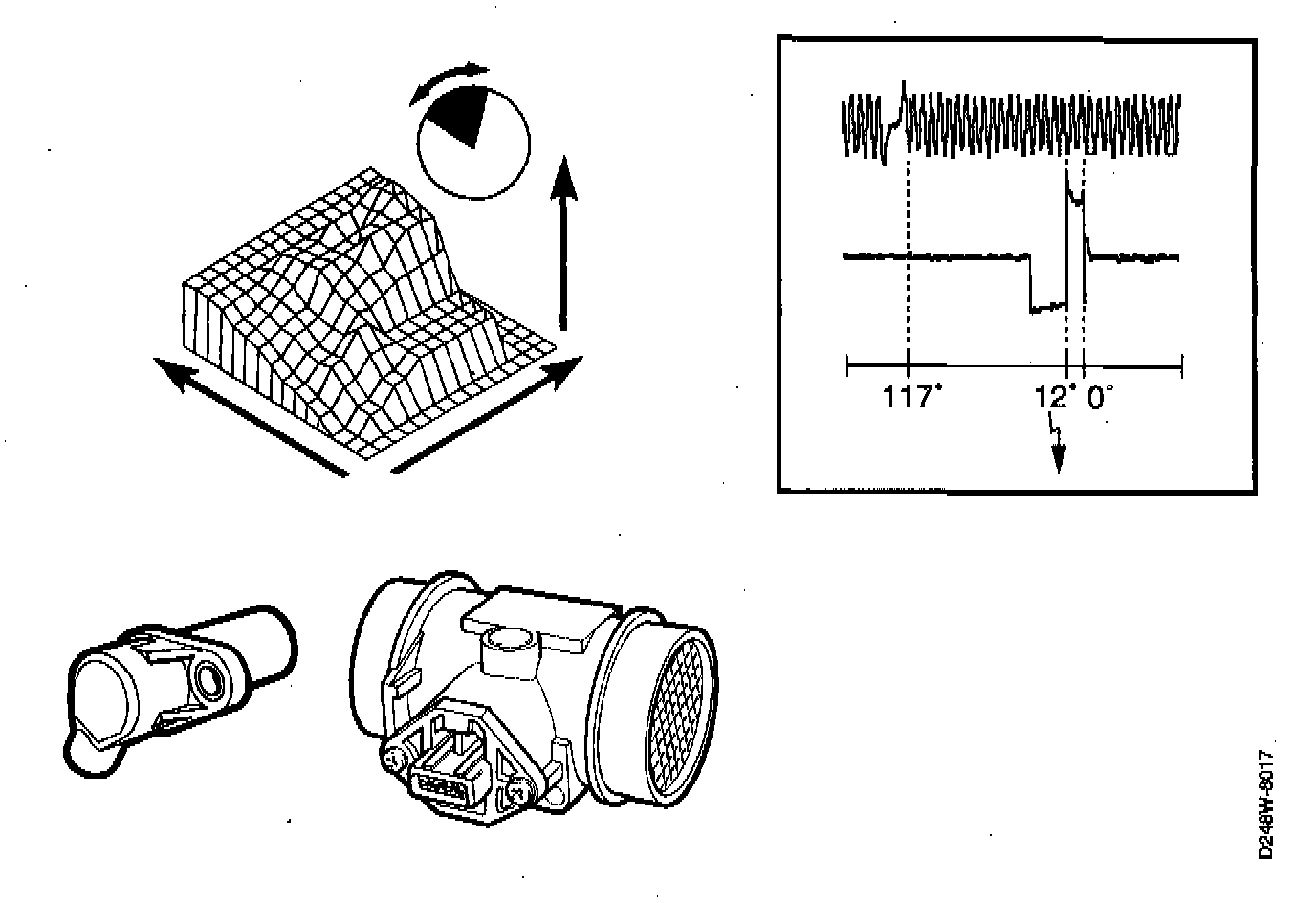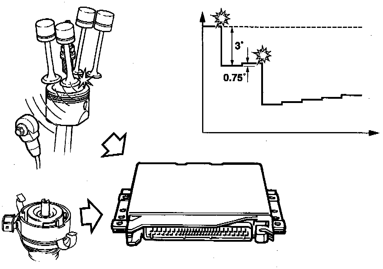 If knocking occurs in any of the cylinders, the ignition will be retarded by 3° for that particular cylinder. If the knocking then stops, the ignition will be restored to what it was before in steps of 0.75°.
