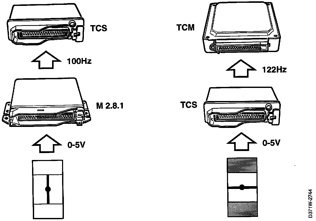 The Pulse Width Modulation signal generally has a fixed frequency of between 75 and 225 Hz, which means that the pulses occur 75 to 225 times a second. In exceptional cases the frequency is not fixed, such as the engine load (Tq) signal from the Trionic system, the frequency of which depends on engine speed but the pulse width reflects the engine load.