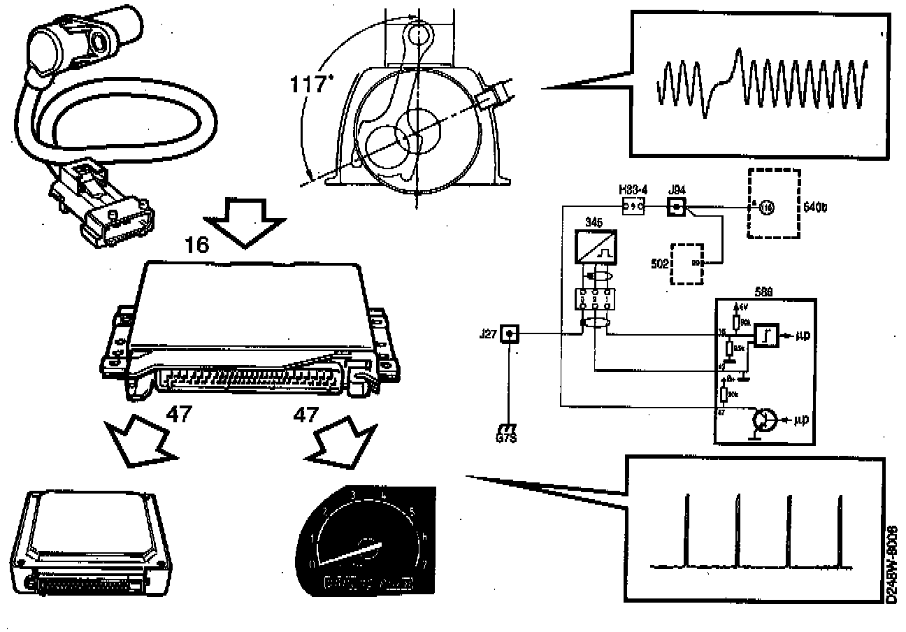 The signal is a pulse train which varies between 0 and B+. Its frequency is about 30 Hz at idling speed and about 85 Hz at 2500 rpm. This corresponds to 3 pulses per crankshaft revolution.