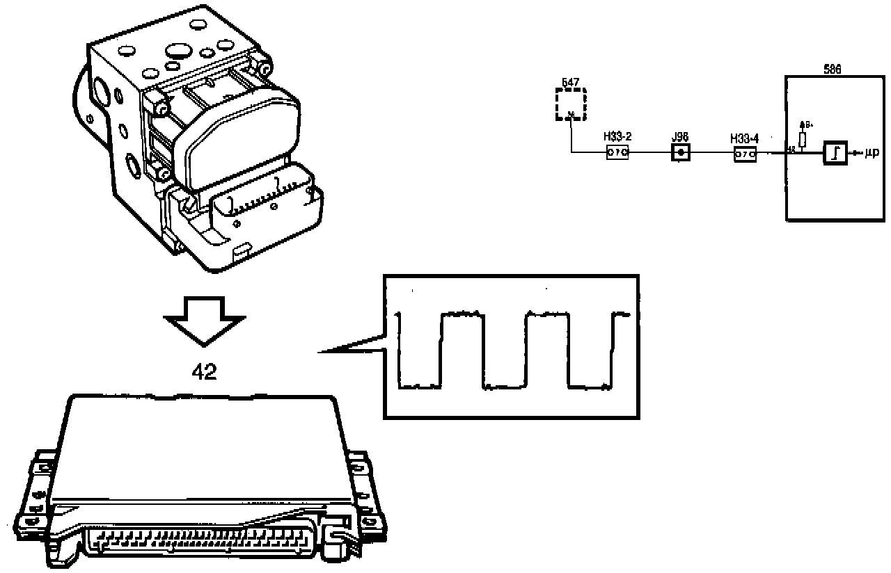 The ABS control module sends a speed signal from the RH front wheel to pin 42 of the Motronic control module. This signal is a square wave which varies between 0 V and battery positive voltage (B+) 29 times per wheel revolution. At 30 km/h the frequency is about 130 Hz.