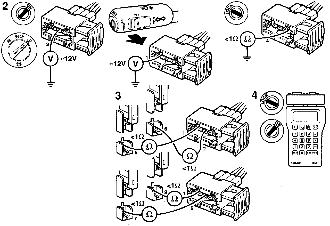 4 Plug in the Intelligent Saab Tester (ISAT) scan tool and select "READ FAULT CODES" from the menu. If any diagnostic trouble codes are present, continue in Trouble Code Tables.