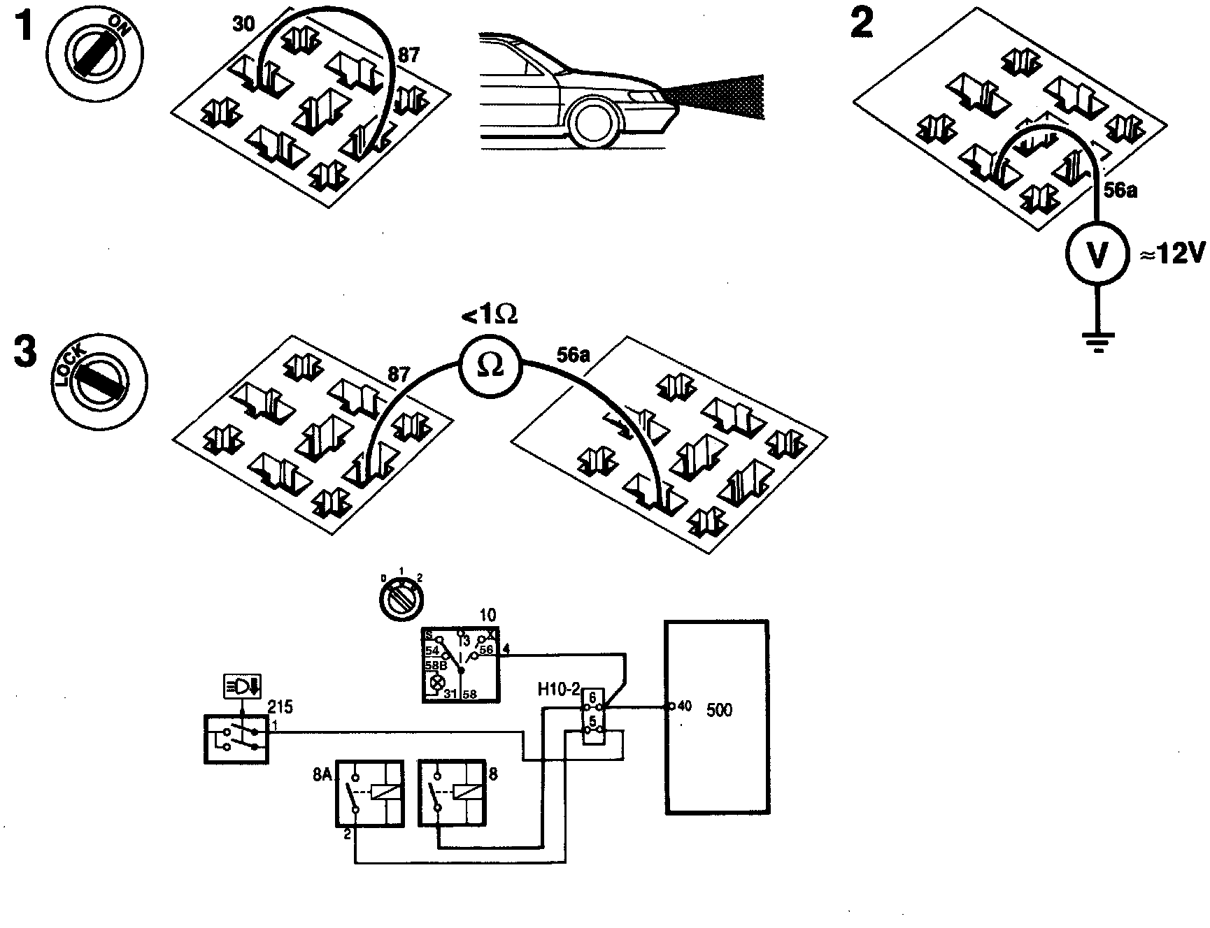 1 Check whether 12 V is present on headlamp relay connector pin 87 in the relay holder.