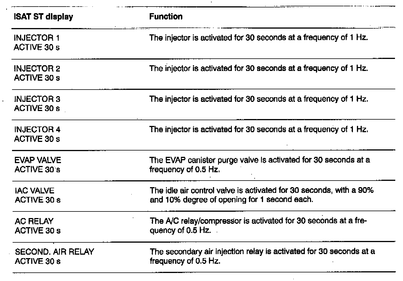 The Intellegant Saab Tester (ISAT) scan tool display texts below are presented in the same order as the commands shown under ACTIVATE in the ISAT scan tool menu structure.