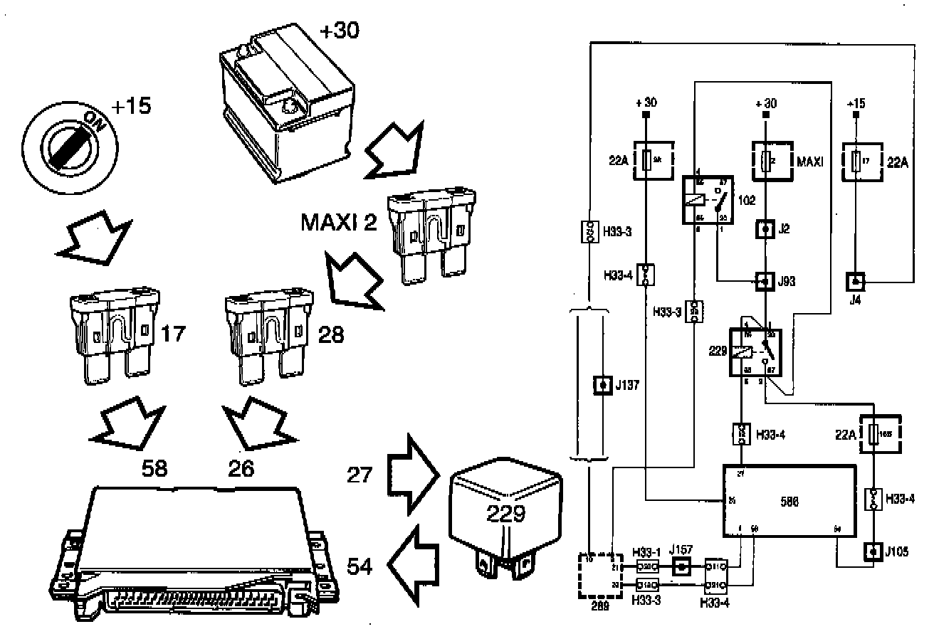 Current (+30 circuit) is supplied to pin 26 of the control module via MAXI fuse 2 and fuse 28.