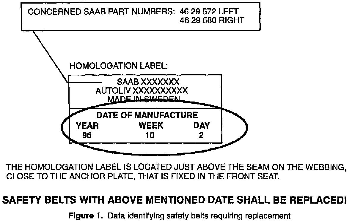 1. Inspect the Campaign plate on all 5-door 900s in the VIN Serial No. Range listed above to see if the plate is stamped in position A5. If the plate is stamped with a numeral 1-8 in position A5, no further action is required. Do not file a warranty claim. Cars shipped from ports-of-entry after 4/25/96 require no modification. Many vehicles were inspected and/or repaired at the ports-of-entry or in Sweden.2. See Figure 1.