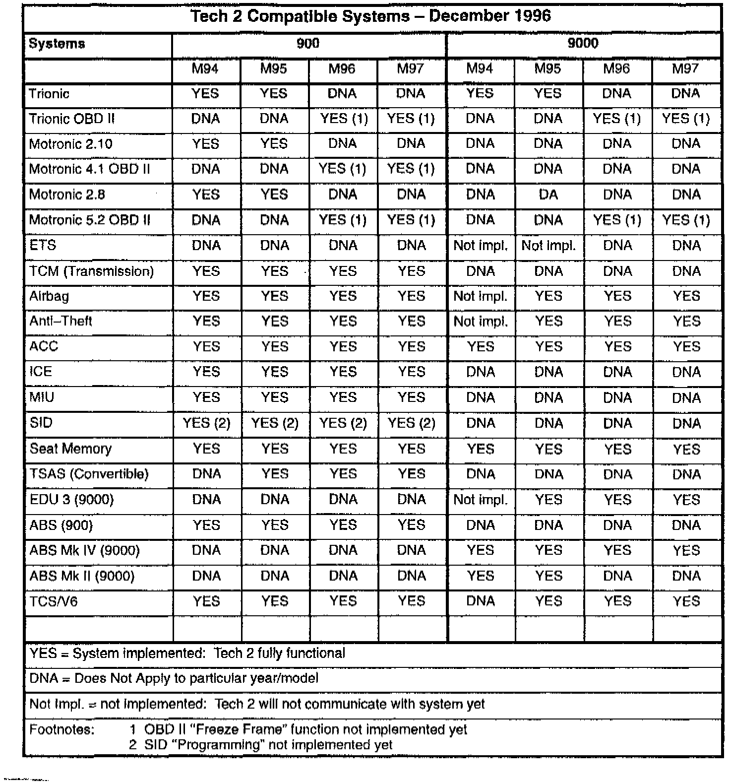 All 1994-97 900 and 9000 systems are fully functional in Tech 2 with the following exceptions: