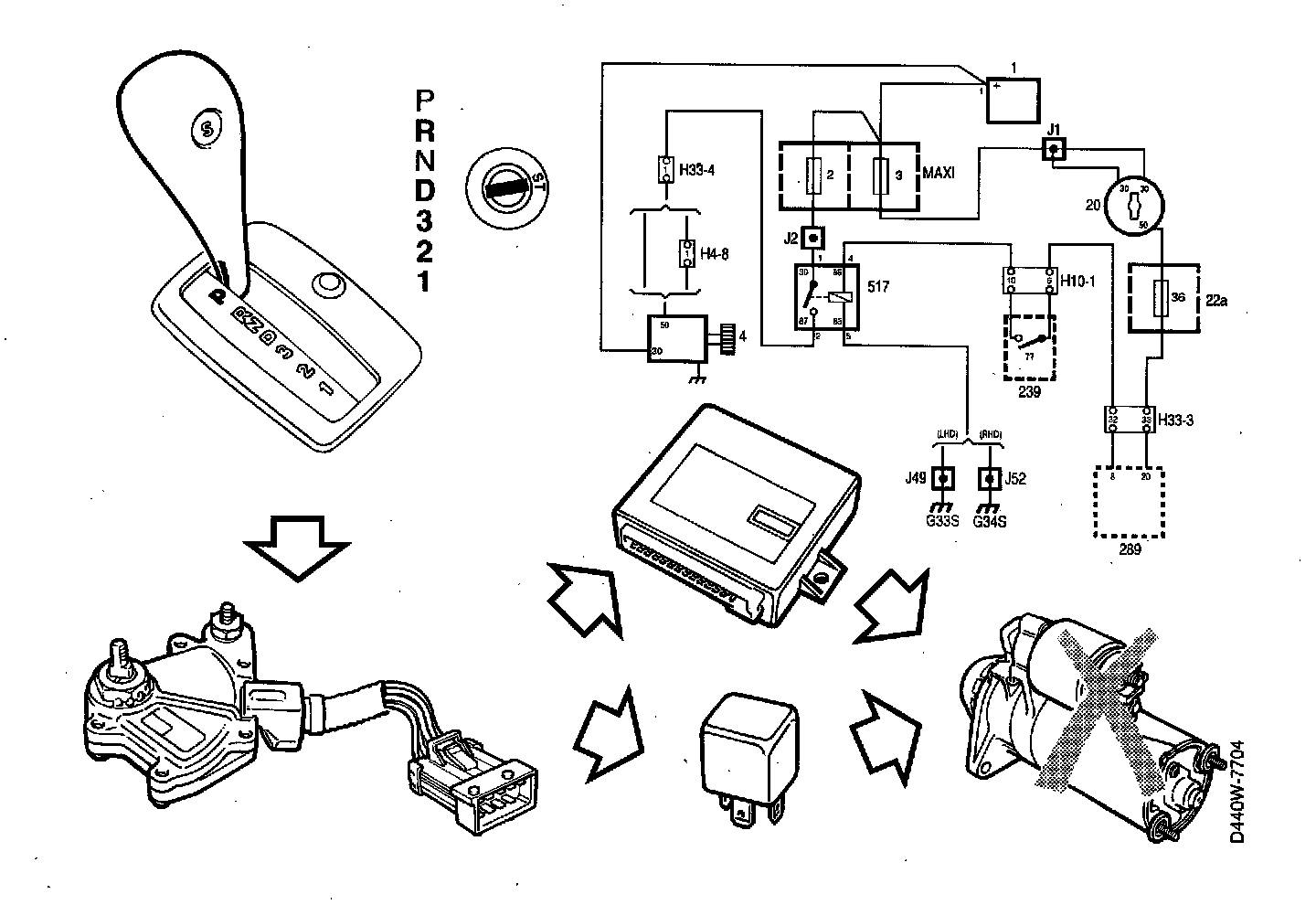 On cars with automatic transmission, the starting interlock switch (77) is integrated with the gear selector position sensor.
