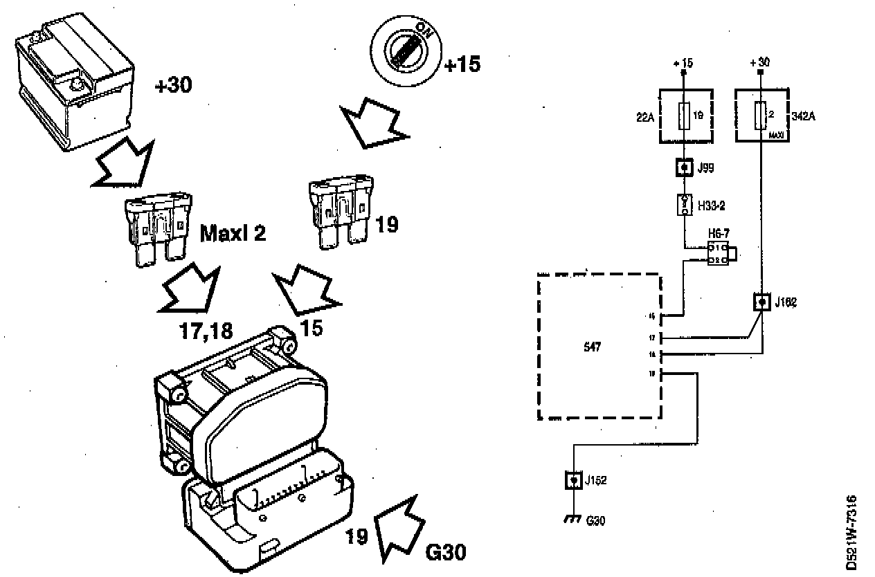 The electronic control module receives a voltage supply +30 from MAXI fuse 2 to pin 17 and 18. The electronic control module voltage receives a supply of +15 from fuse 19 to pin 15. The electronic control module is grounded from pin 16 to grounding point G30 The pump motor is grounded via pin 19 to grounding point G30