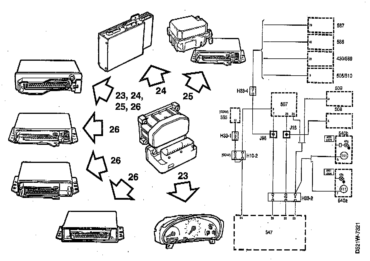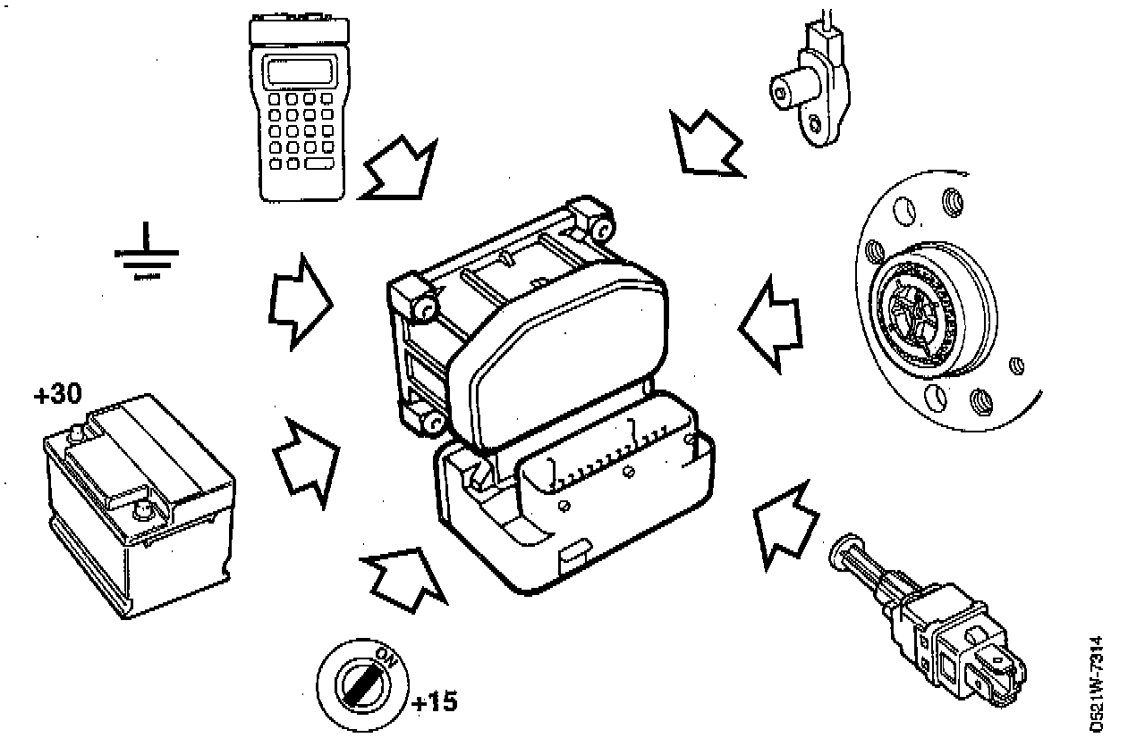 The ABS electronic control module receives vehicle speed information from the wheel sensors in the form of a.c. voltage of varying frequency. The a.c. voltage is processed in the electronic control module to four edged pulses that are transmitted to the following points.