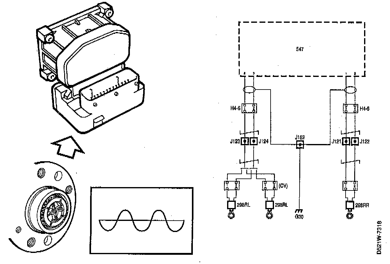 The inductive sensor operates similar to a small a.c. generator that's sinusoidal potential increases with increasing wheel speed. The sinusoidal potential changes between negative and positive polarity, that is caused by alternating teeth and gaps on the gear wheel. The electronic control module uses this alternation of polarity like a pulsating transmitter. The pulse frequency increases with the wheel speed.