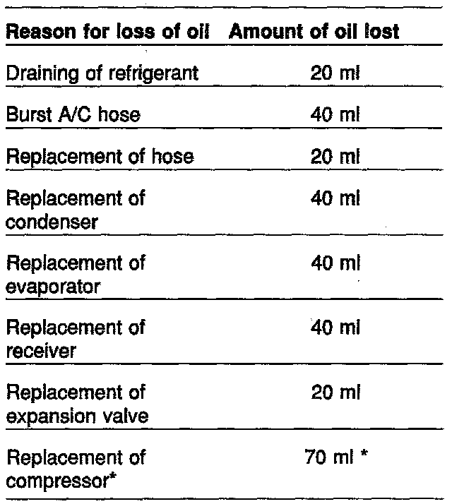 The table above shows how much compressor oil is lost in connection with various types of work on the A/C system.