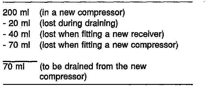 ^ If a new compressor only is to be fitted, drain 110 ml of oil from it (200-70-20 = 110). For example, if you also install a new receiver, only 70 ml should be drained from the compressor, as shown in the table above.
