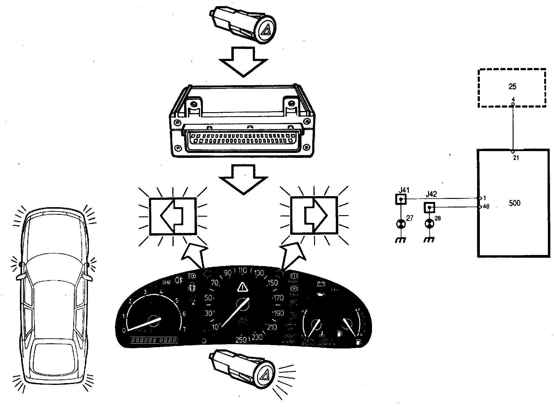The ICE module supplies power to the left-hand and right-hand direction indicator lamps and to the indicator lamps in the main instrument display panel, which start to flash at the same time.
