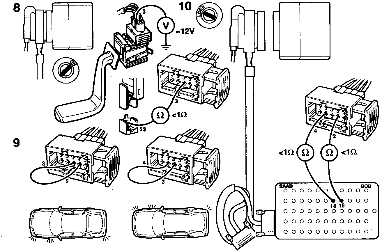 - between pin 3 of the connector for the front direction indicator lamps and a good grounding point.