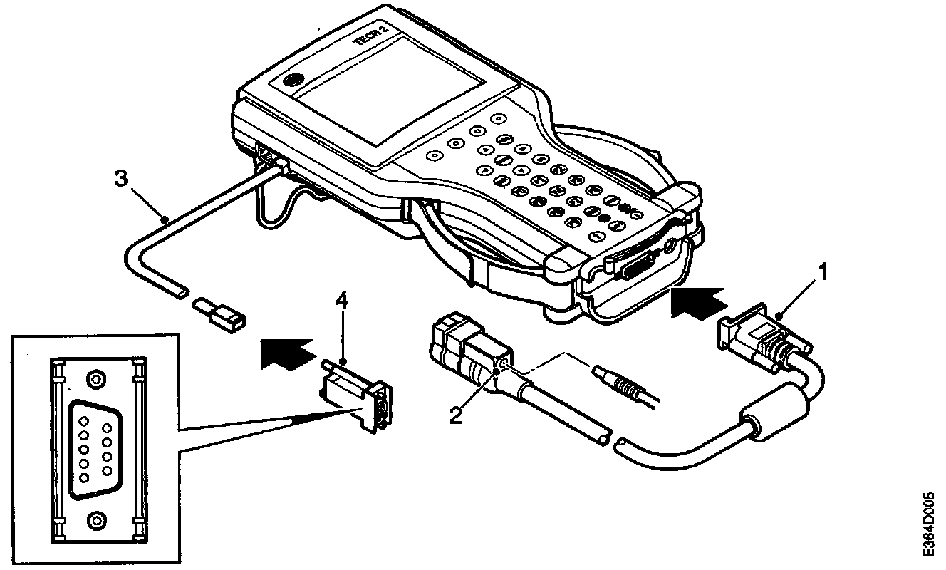 An RS232 cable and DB9 adapter are required for communication between the Tech 2 and a computer for the purpose of downloading data. The cable plugs into the RS232 port on the Tech 2.
