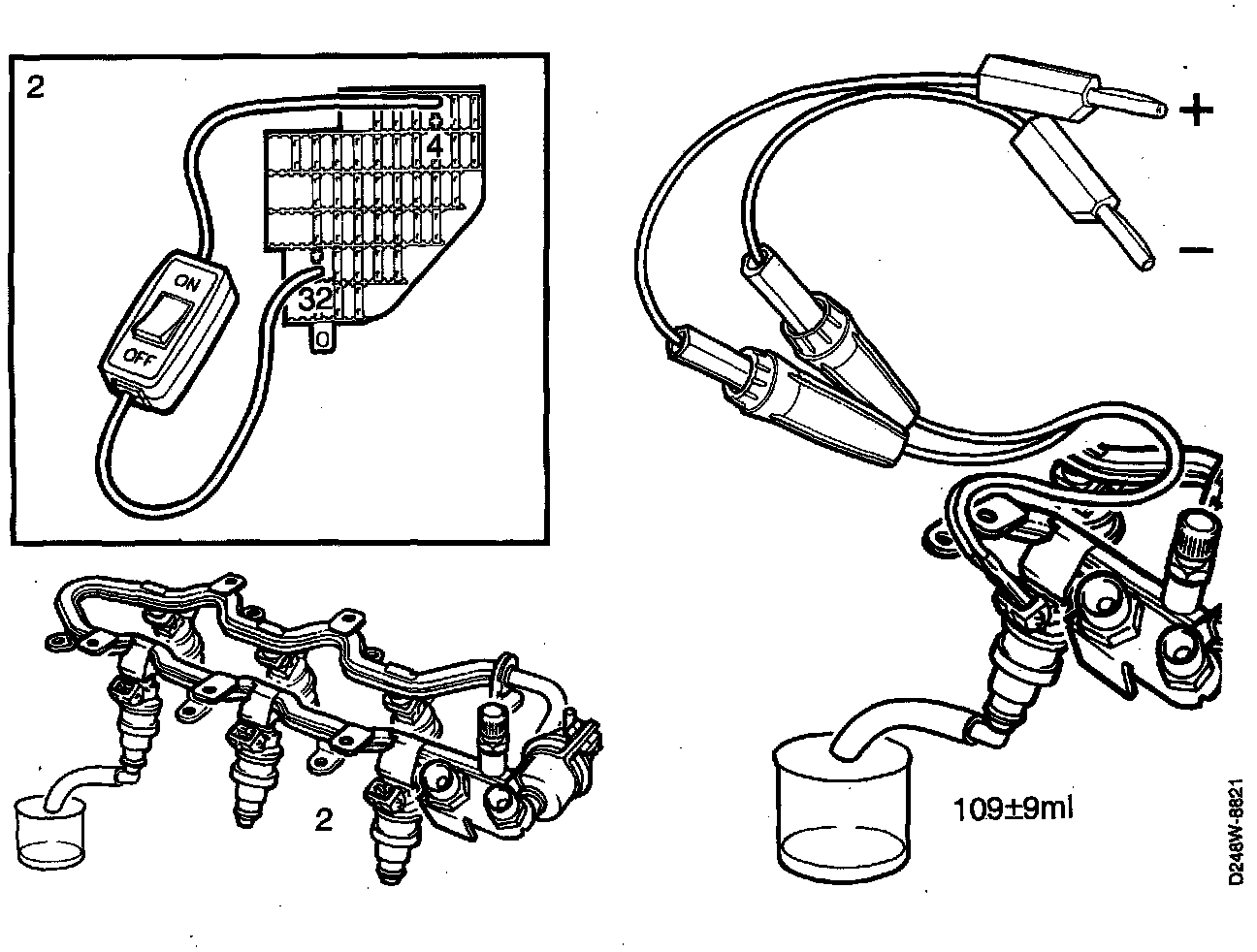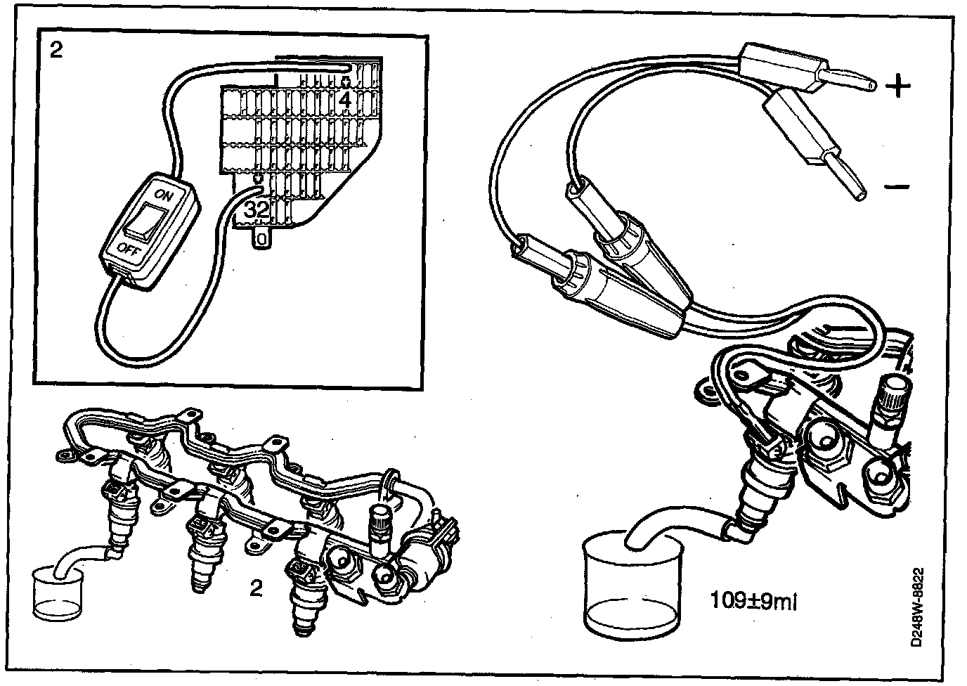 3. Place the injectors one by one over a measuring flask and connect battery voltage to the injector that is to be checked, using cables 86 11 410 and 86 11 345.