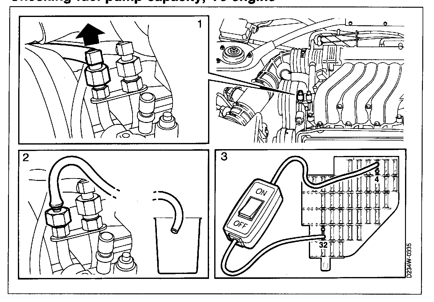 3. Run the fuel pump for 30 seconds, using battery voltage from fuse No.4 (input) connected to fuse No.32 (output) in the fuse box.