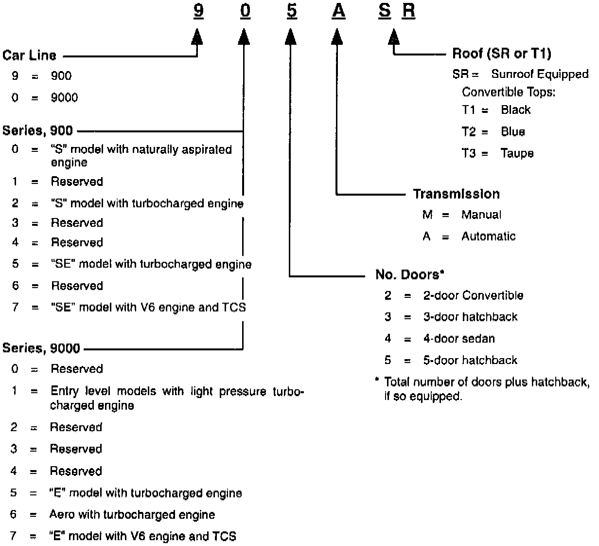 This model code scheme was instituted by Saab Cars USA, Inc. effective model year 1981 as an internal shorthand identifier system for car inventory control, ordering and technical follow-up. These codes are not for public recognition in lieu of actual model names.