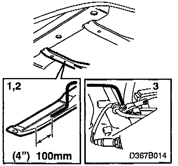 1. Drill a hole with a 3.5 mm (5/32 in.) bit in the right-hand part of the subframe about 100 mm (4 in.) from the bend at the front, see illustration.