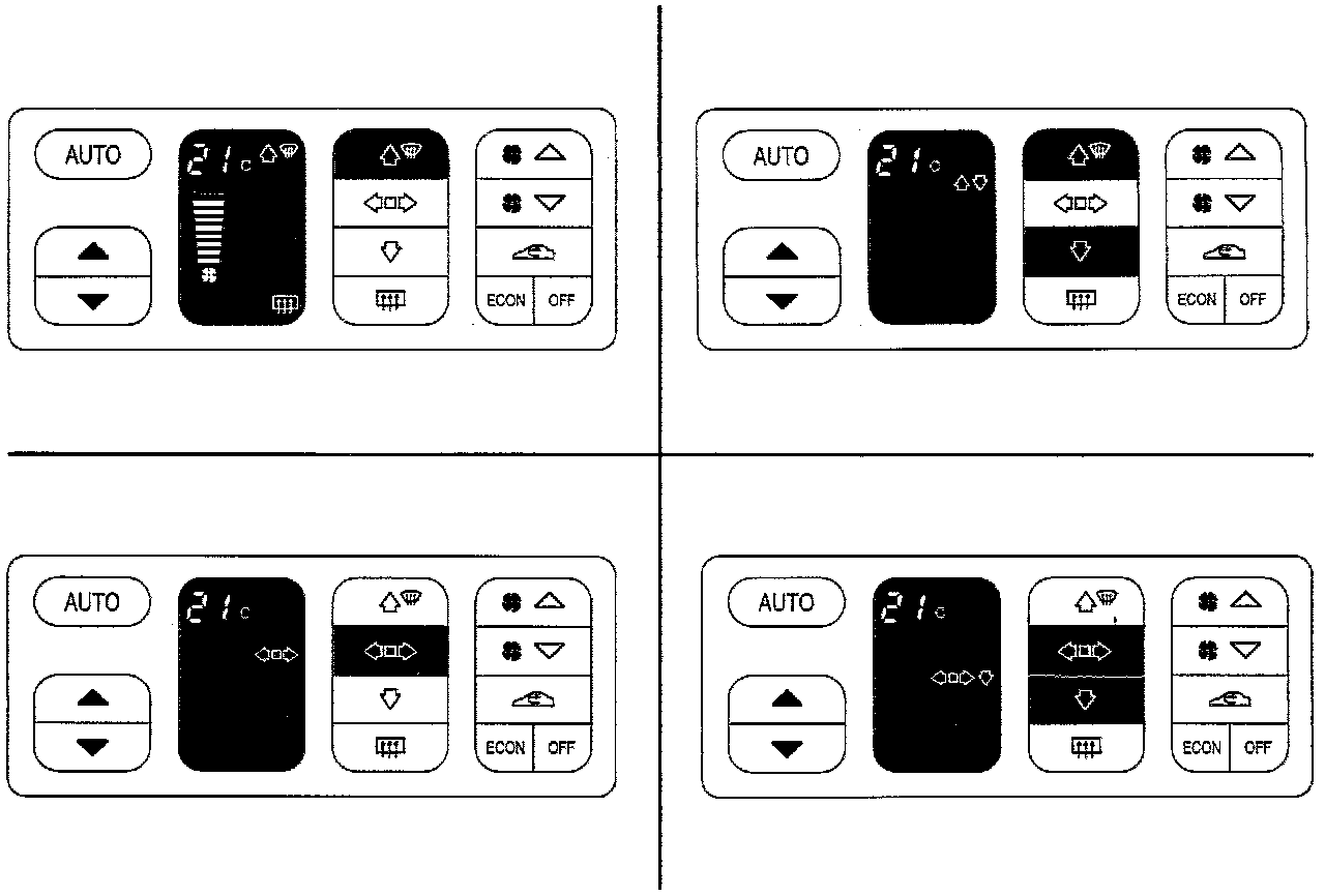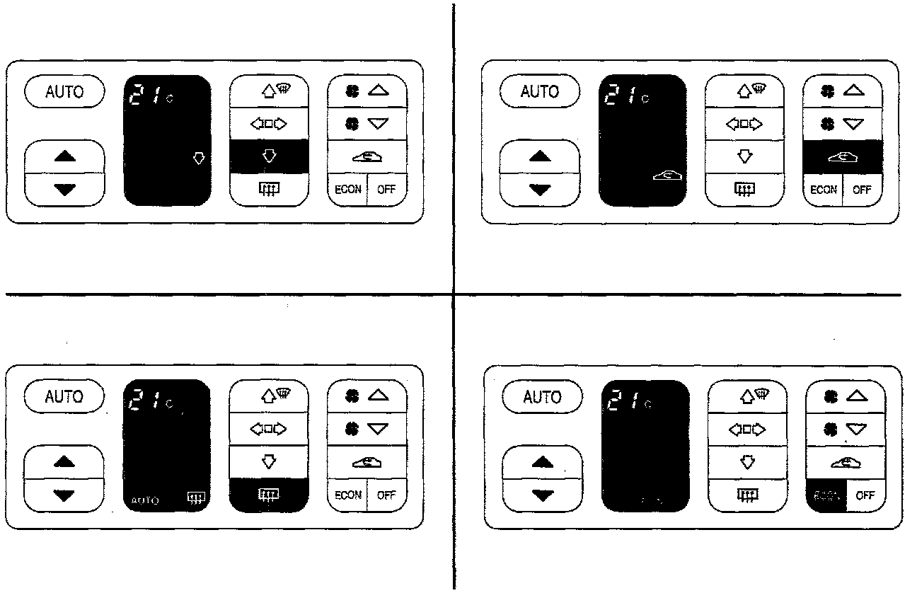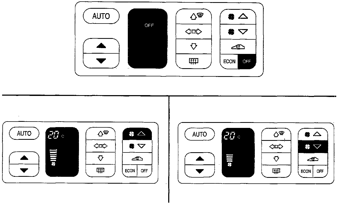 A/C and recirculation are turned OFF. In other respects control takes place as in the AUTO mode. ECON is shown on the display.