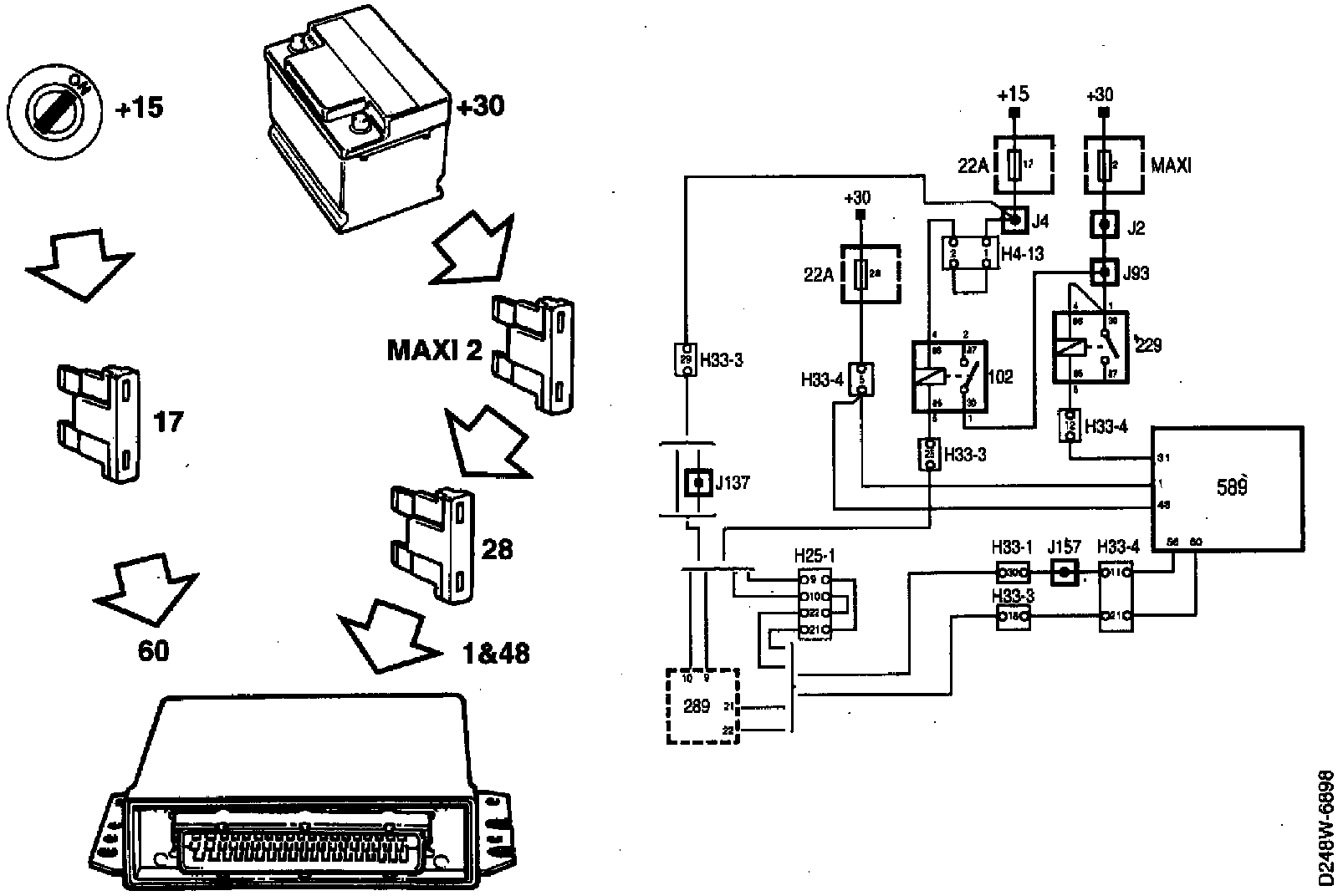 Power (+30 circuit) is supplied from maxi fuse 2 to the main relay, fuel pump relay and fuse 28. Power is supplied to ECM pins 1 and 48 from fuse 28.