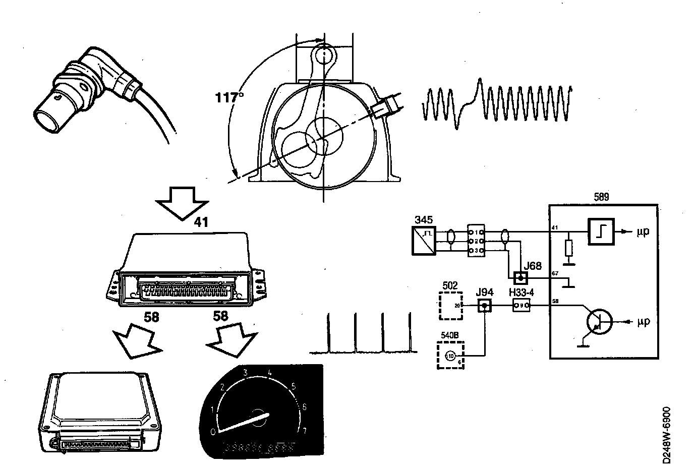 The sensor acts as a generator and produces a sinusoidal alternating current. By measuring the frequency, the engine control module can determine the speed at which the engine rotates (rpm). After the 58th rib is a gap corresponding to 2 ribs. When rib No. 1 subsequently passes the sensor, the engine control module knows that the crankshaft is 117° before top dead centre (BTDC).