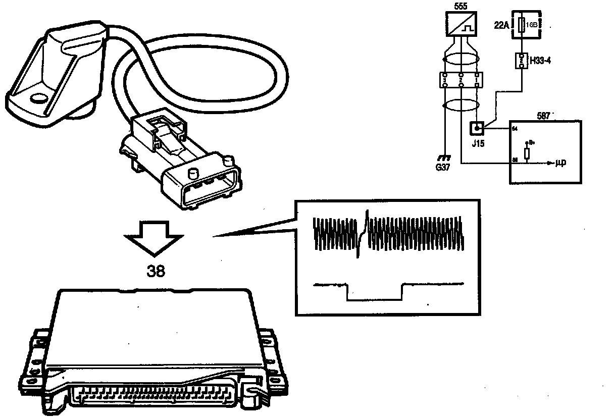 The exhaust camshaft sprocket has a hub with a ridge which passes the Hall-effect sensor once per camshaft revolution. The sensor output is connected to pin 38 of the control module.