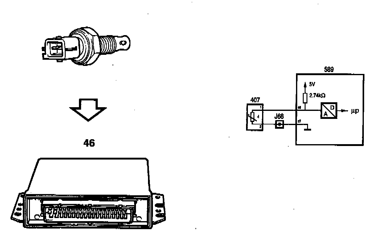 The engine control module measures the temperature of the air in the intake manifold by applying 5 V to the sensor from pin 46 via an integral 2.74 kohm resistor.
