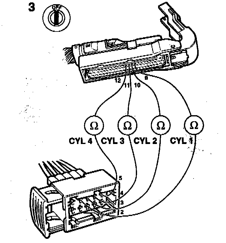 - Take a resistance reading across pins 1 and 2 of the relevant injector's connector.