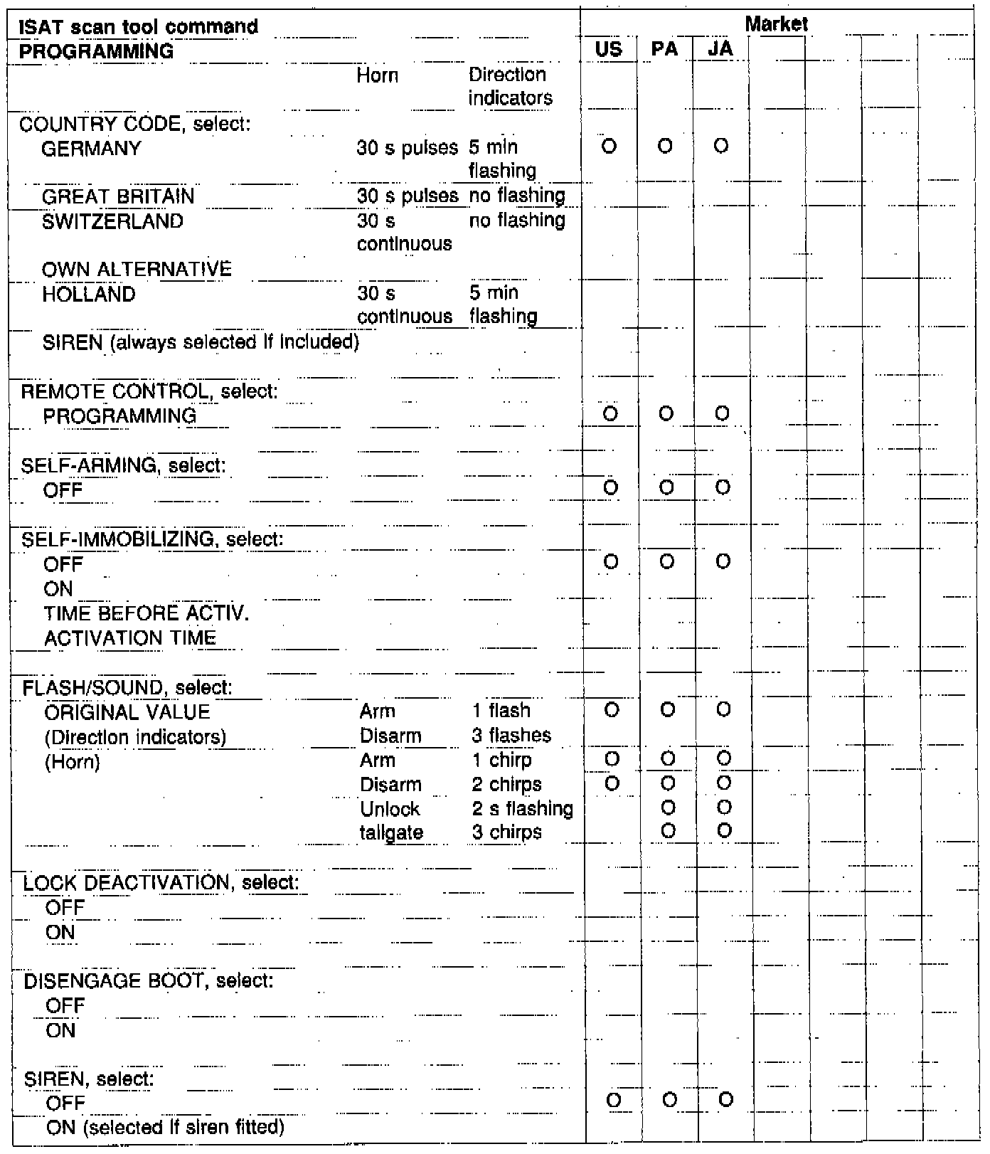 Basic programming of the anti-theft alarm's electronic control module is carried out by the supplier. Subsequently, EOL programming is carried out at the factory. However, since this cannot meet the needs of all countries, additional programming has to be carried out in connection with pre-delivery service, see table below. In the event of electronic control module replacement, the anti-theft alarm must be programmed in accordance with spare part programming, see table below.