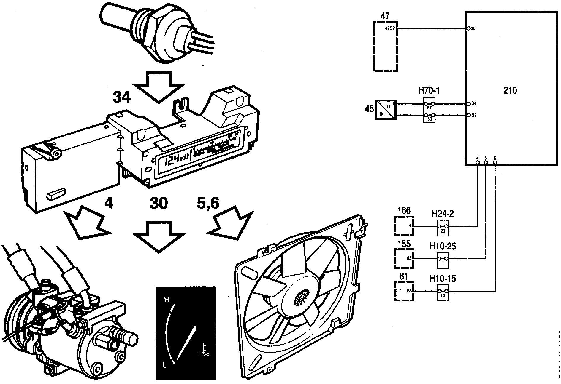 If the resistance in the resistor is under 66 Ohms or over 100 kOhms, a diagnostic trouble code is generated in the control module and the control module starts the radiator fan until the fault is remedied.
