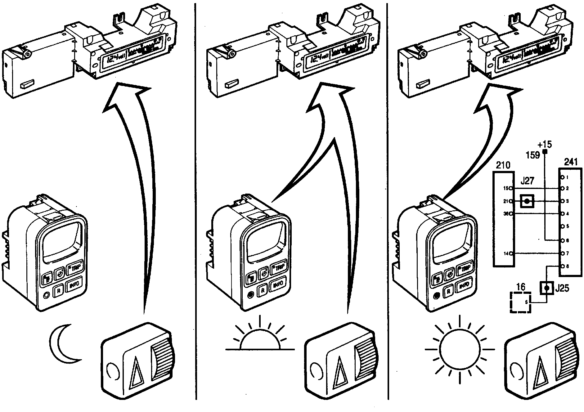 When driving in daylight, the light in the cabin is measured by a light sensor on the Saab Car Computor (SCC) unit or on the front of the clock. Depending on the intensity of the light, pin 36 on the control module is fed by the light sensor that controls the lighting with a voltage in the range 0 V - 10 V.