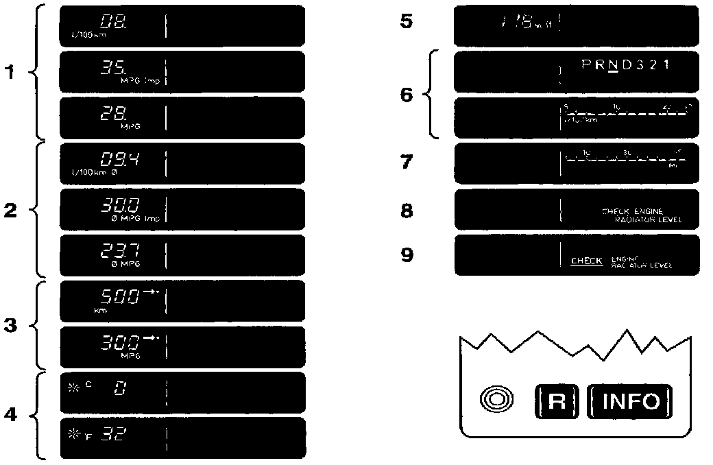 To change the units displayed, hold the INFO and R buttons depressed for at least 4 seconds. Each time they are depressed, one of the following four groups is selected: