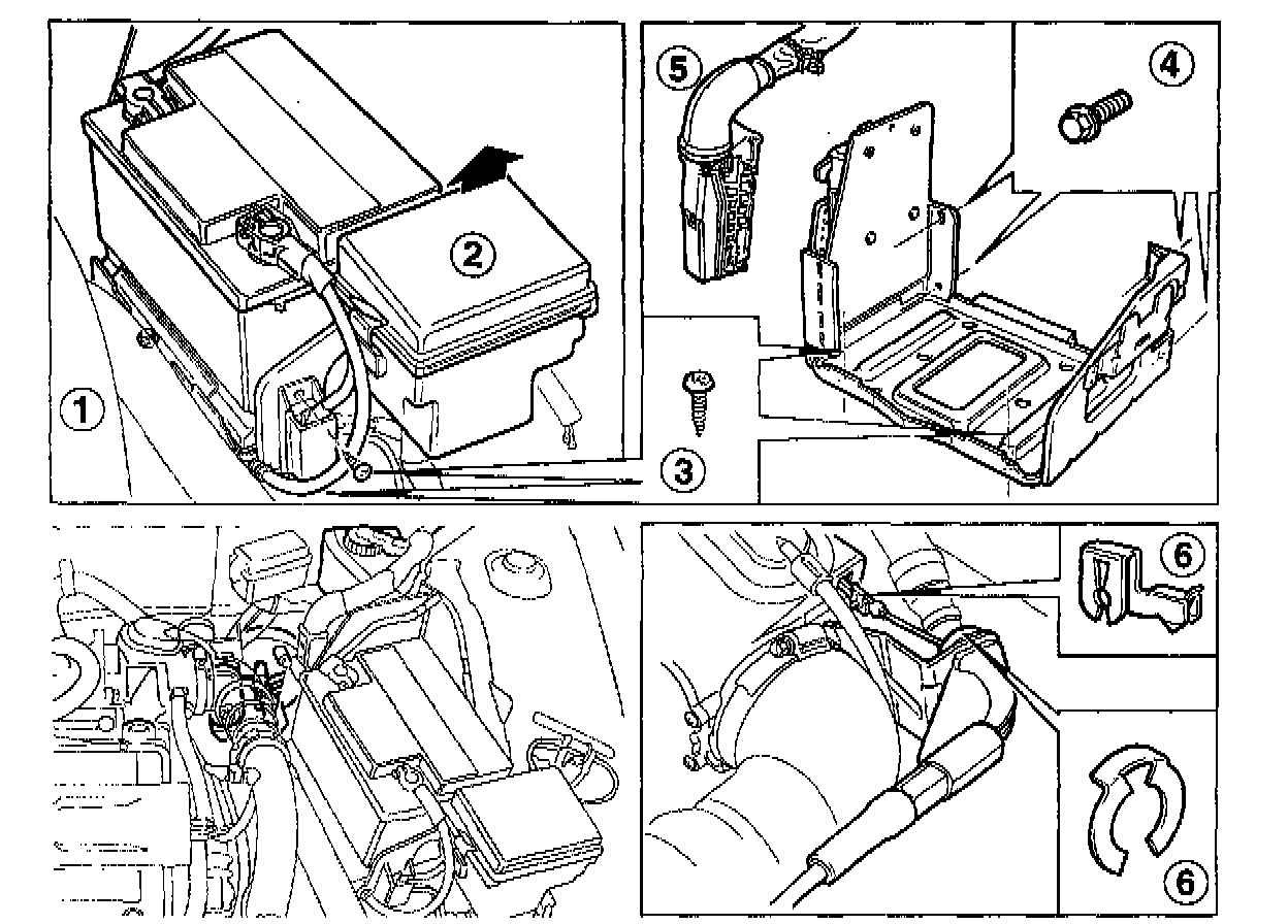 4. Remove the throttle cable from the throttle housing by disconnecting the two clips (6).