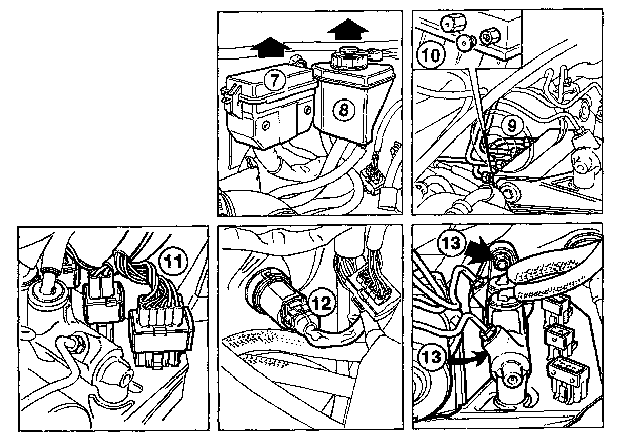 5. Pull the ABS main fuse box (7) and brake fluid reservoir (8) out of their brackets.