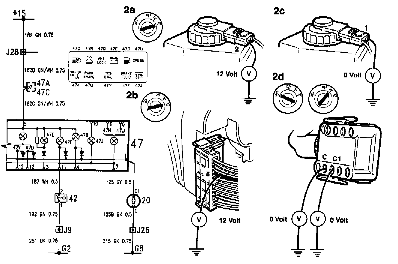 - Test position of ignition switch = 0 V.