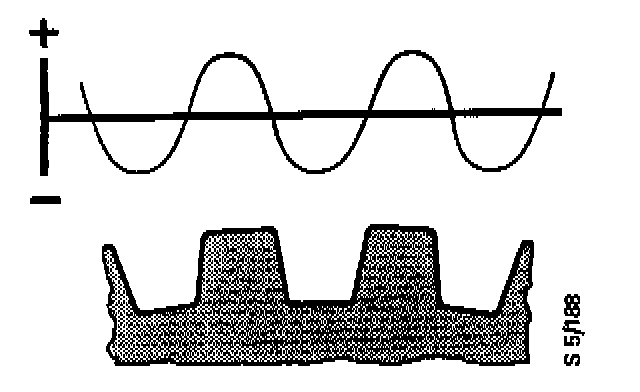 The wheel sensors operate on the generator principle, i.e. a current is induced in a conductor by distortion of the magnetic field surrounding it. Distortion of the magnetic field around the sensor is caused by the toothed sensor as it passes the sensor body: each time a tooth passes the sensor, the magnetic field is reinforced. Each time a gap between the teeth passes the sensor, the magnetic field is weakened. Put simply, this means that a positive (+) current is generated by each tooth and a negative (-) current by each gap between the teeth. This gives rise to an alternating current, the frequency and amplitude of which (the number of cycles per second and half the peak-to-peak value respectively) varies with the speed at which the sensor wheel is turning. From this signal, the Electronic Control Unit (ECU) ran deduce the speed of rotation of the wheel.