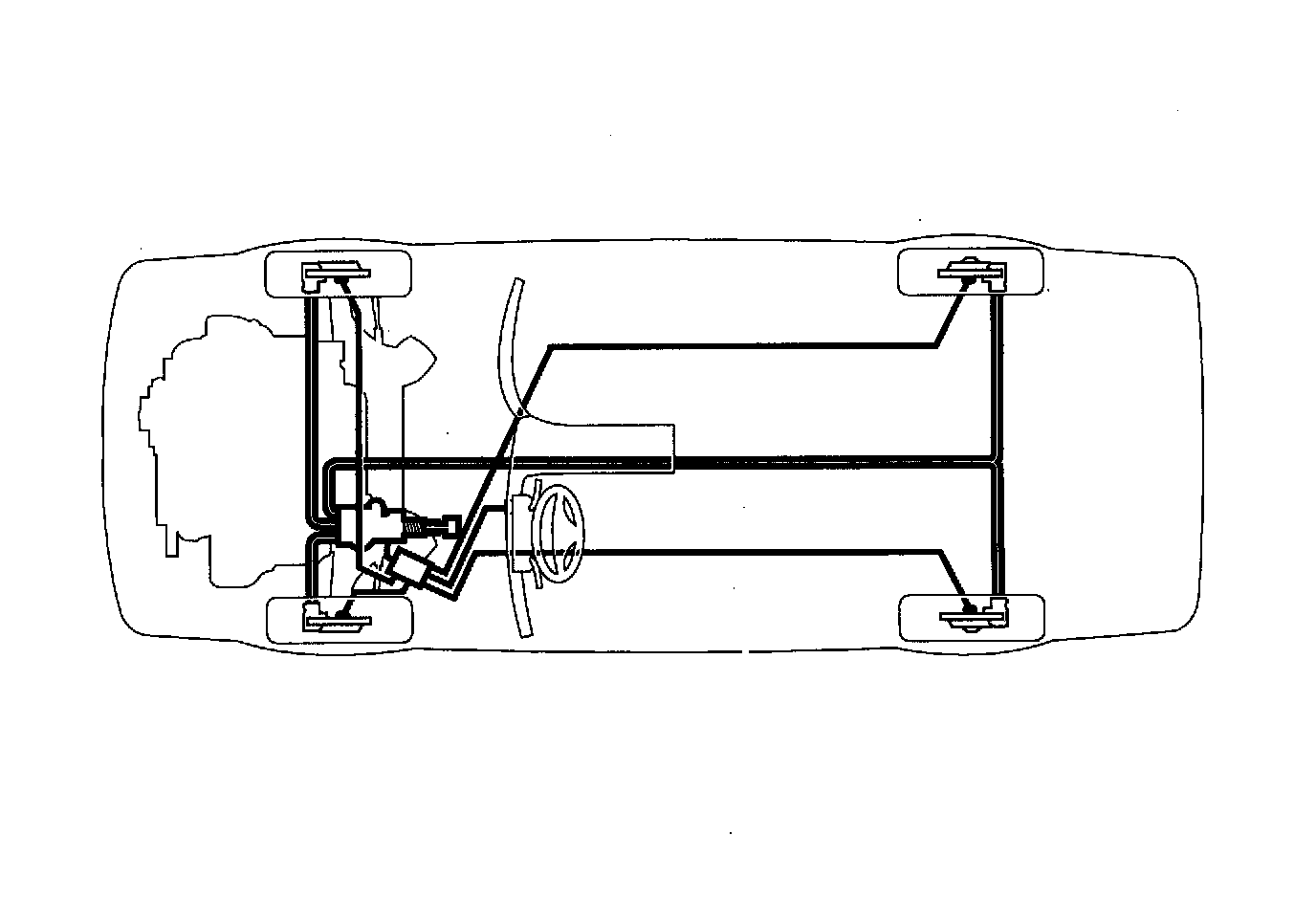 The hydraulic brake system consists of two separate diagonal brake circuits. One circuit is for the righthand front wheel and left-hand rear wheel (primary circuit) and the other circuit is for the left-hand front wheel and right-hand rear wheel (secondary circuit). With the circuits split in this way, if one circuit should fail because of leakage, for instance, the other circuit still remains operative and always provides at least 50% of the total braking power.