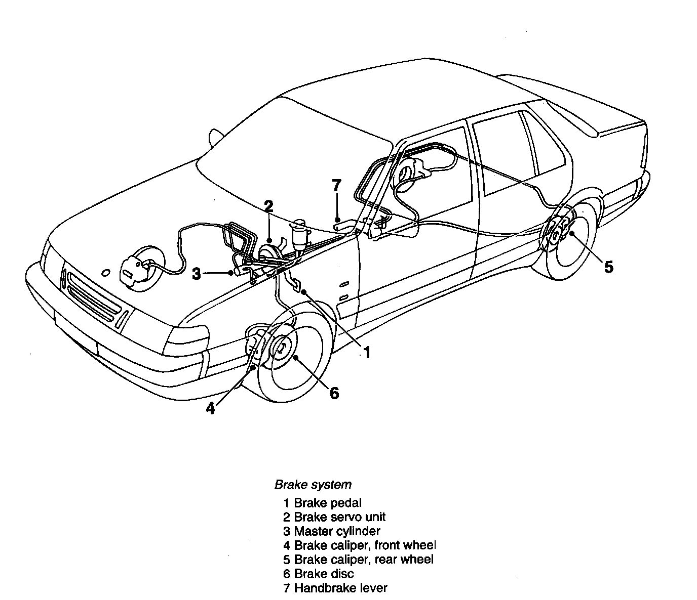 The hydraulic brake system is operated by the brake pedal and acts hydraulically on all the wheels. The handbrake system is operated by the handbrake lever and acts mechanically on the rear wheels.