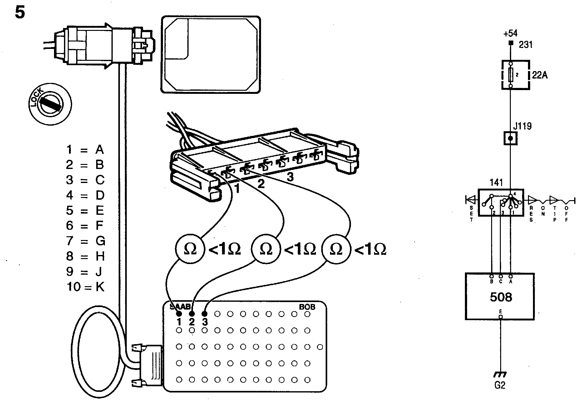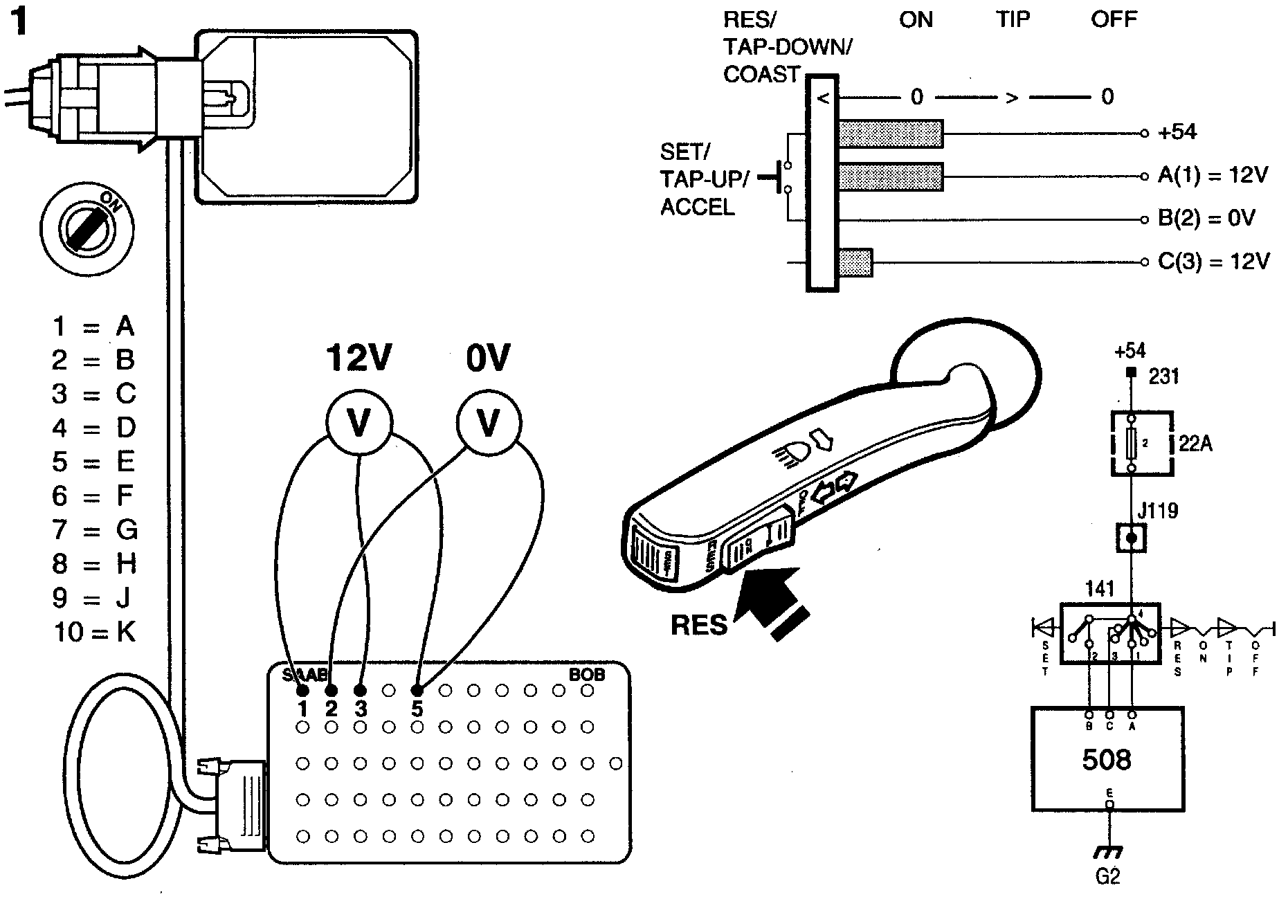 - pin 1 of the switch connector and pin A (1) of the Cruise Control connector.